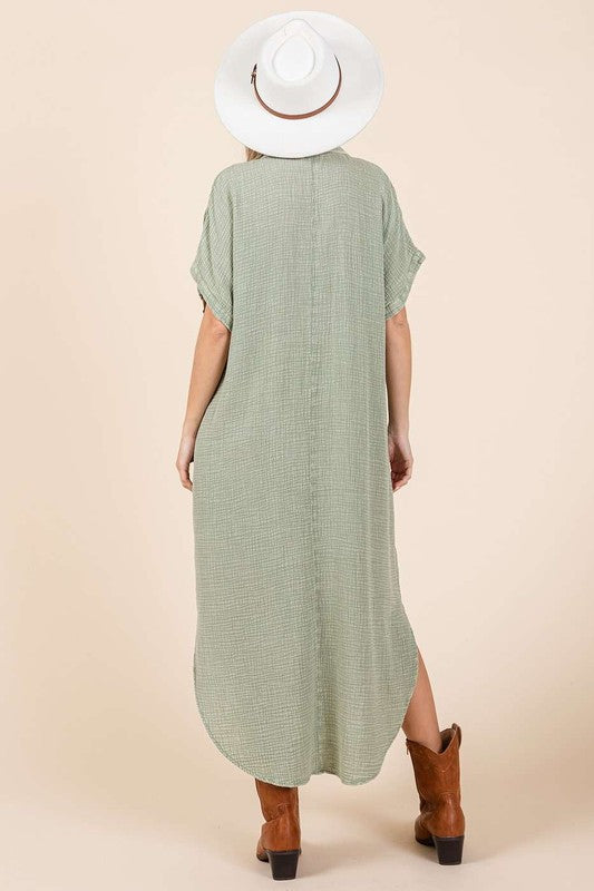 Mittoshop Mineral Wash V Neck Button Up Midi Shirt Dress