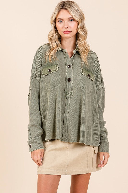 Mittoshop Mineral Wash Waffle Knit Collared Neck Henley Top